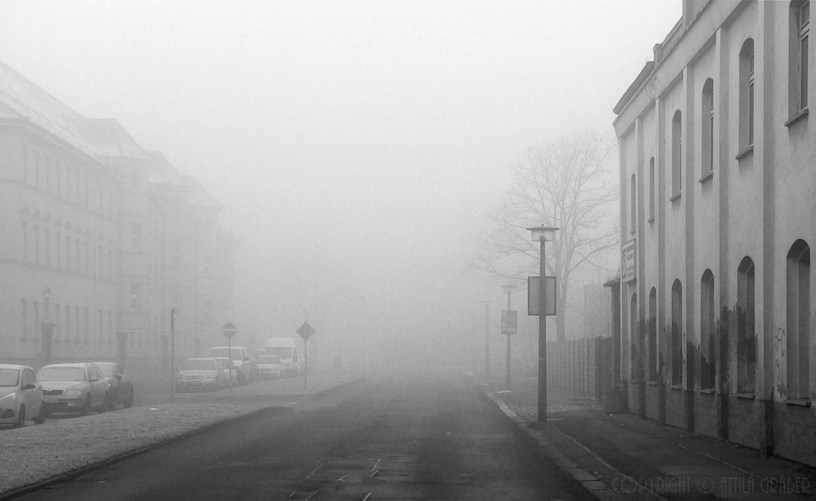 The road is becoming harder to navigate. I imagine the buildings are closing in like those trap walls you see in suspense movies, but they stay as still and lifeless as they always have. I know this, but my mind is playing tricks on me, making them look like optical illusions in the fog.